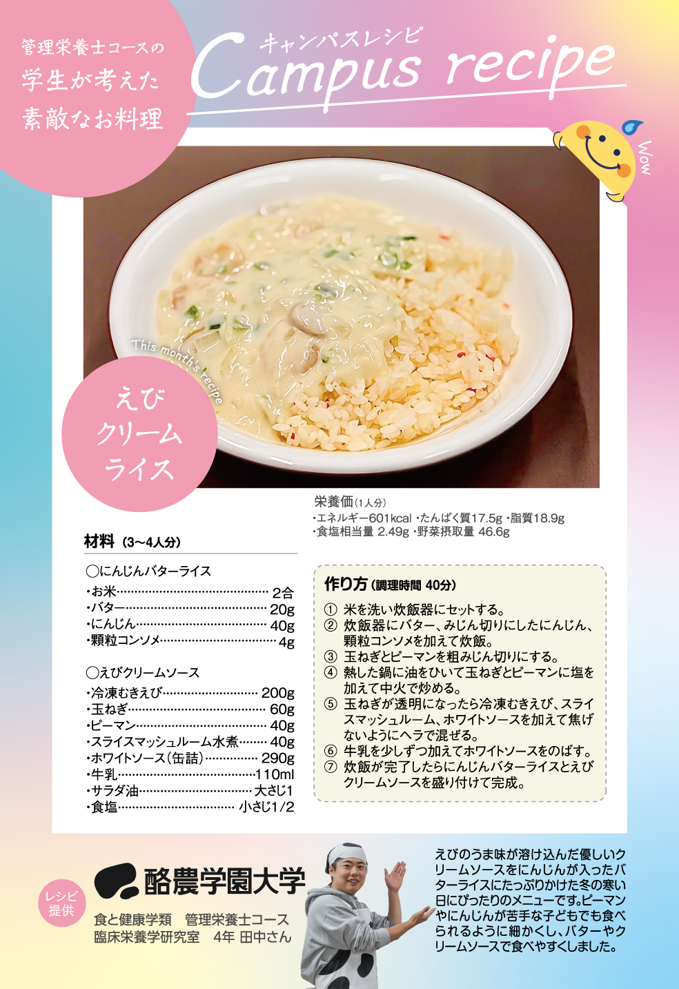 今回は旭川ガスにて発行されているガスだより「ほっと」12月号から 管理栄養士コースの学生が考えた素敵なお料理 Campus recipe「えびクリームライス」をご紹介いたします。